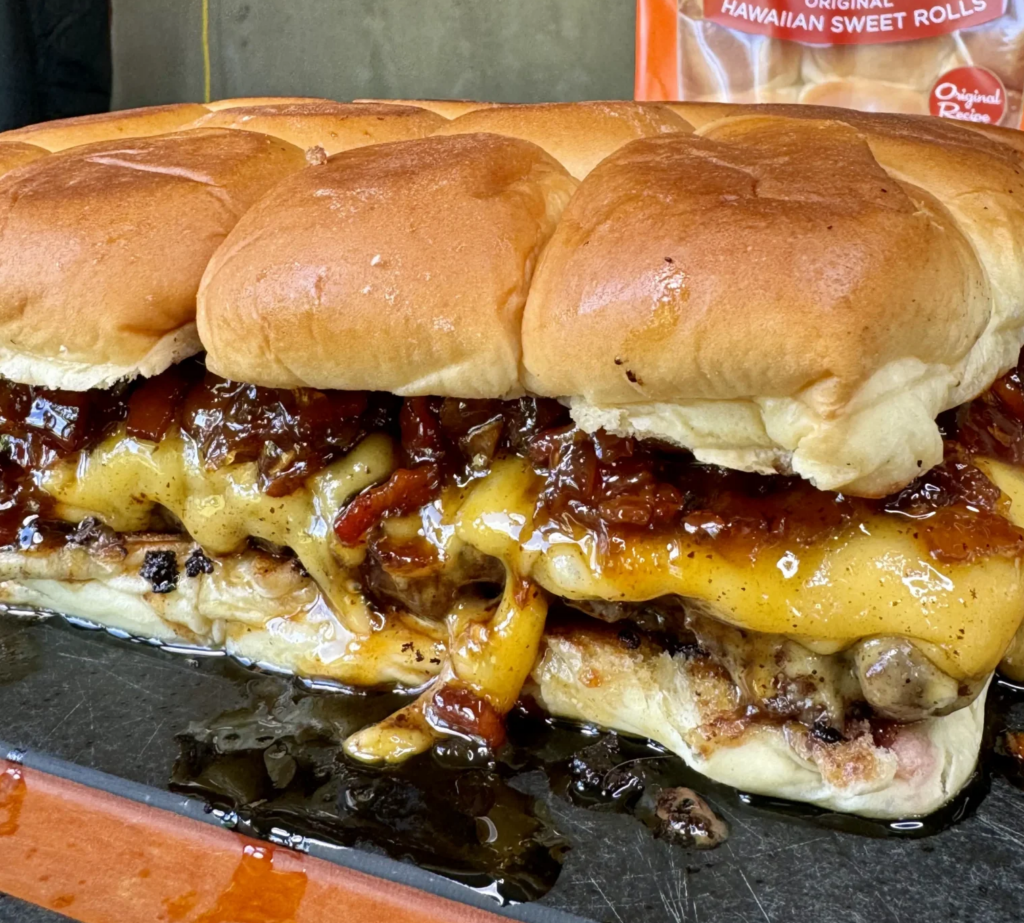 - Toast buns, assemble sliders with bacon jam. Cut and serve.